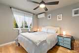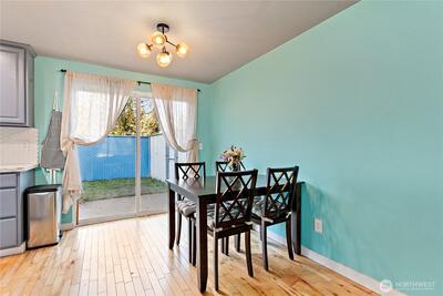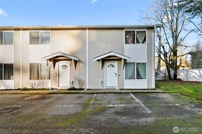 Enjoy easy living near American Lake and Harry Todd Park in this gated community condo featuring a thoughtfully designed 2-bedroom, 2-bath layout. As an end unit, the home benefits from added privacy and a more open feel. Hardwood flooring flows through all living areas, leading to an updated kitchen with quartz countertops, tile backsplash, and stainless steel appliances—ideal for both everyday living and entertaining. The bathrooms offer tasteful modern updates, while an in-unit washer and dryer and mini-split system provide year-round comfort. Both bedrooms are generously sized, offering flexibility for comfortable living, guest space, or a home office. Upstairs, partial lake views add a peaceful backdrop, and a fully fenced, private grassy backyard creates a great space to unwind or gather with friends. A designated parking space adds convenience, and HOA dues include water, garbage, and septic. Just minutes from JBLM, this move-in-ready home combines comfort and privacy.