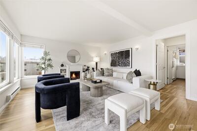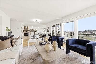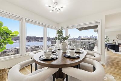 What if your balcony came with front-row seats to Seattle’s most iconic views? Experience elevated city living in this stunning 2-bedroom, 1-bath corner unit offering 1,144 square feet of expansive open-concept design and truly unforgettable views. With breathtaking 270-degree panoramas spanning South Lake Union, the Seattle skyline, the Cascade Mountains and 4th of July fireworks enjoyed right from your private balcony. With city views like this; You’re not just close — you are center stage. The thoughtfully updated kitchen seamlessly connects to the spacious living and dining areas, creating an ideal layout for both everyday living and entertaining. Large windows flood the home with natural light, enhancing the airy feel and maximizing the spectacular outlook from nearly every angle. Both bedrooms are generously sized, offering flexibility for guests, a home office, or additional living space. Additional features include dedicated parking for the unit and a private storage are