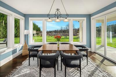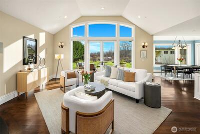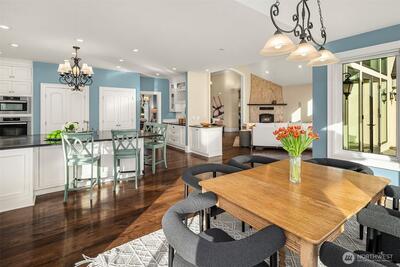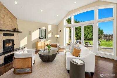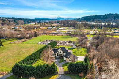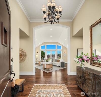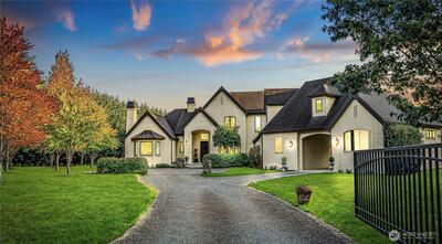 Perfectly positioned near downtown Woodinville, this beautiful custom-built home offers the area’s best in wine-country living, minutes from lifestyle amenities and key routes to the area’s job hubs. The unprecedented location offers utmost privacy, framed by mature hedges and farmland. A gated entry, porte cochere, and curving drive create a sense of arrival. Architectural details balance clean lines with traditional elements, while interiors maintain a timeless aesthetic with wide-plank hardwood and a fresh,modern open plan with living spaces orientated towards expansive territorial & Mt. Rainier views. Fabulous epicurean kitchen features custom cabinetry with striking soapstone counters,center island & eating bar,casual dining nook, & butler’s pantry near formal dining. The adjacent great room has 13’ ceilings and French doors to a lovely outdoor terrace & park-like grounds. An oversized fireplace warms the main floor on cool days. Also on main,a romantic primary suite wit