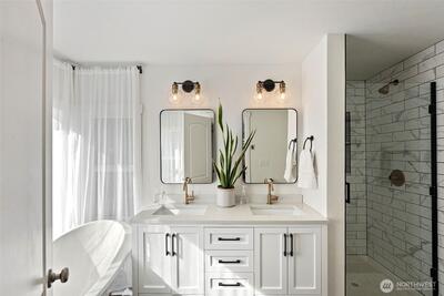 Nestled in a private cul-de-sac, on just shy of an acre and backing up to Pierce County's 100 Acre Woods, you will find this incredible home with sport court, RV Parking, and 5-car garage. Step inside the home to find gorgeously refinished hardwoods, kitchen that boasts a dual fuel oven, granite countertops, and open concept layout to cozy living room fireplace and doors that open to fully covered back deck. Primary bedroom has ensuite with clawfoot bathtub & heated tile floors. On the lower level you will find a 2nd living space with 2 additional rooms/1 bath, kitchen, and walkout to the perfectly manicured backyard & patio. Great for hosting or utilizing as a sublet! This home is a must see!