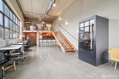 Rare opportunity to own a commercially zoned live/work condo in the highly sought-after Starpoint community in the heart of Issaquah Highlands, offering valuable high-traffic, street-front exposure. This prime ground-floor end unit features a formal storefront entry, ADA-accessible bathroom, soaring ceilings, and walls of windows with solar shades that flood the space with natural light, creating a striking modern urban aesthetic with polished concrete floors and track lighting. The flexible layout allows for a wide range of uses including office, medical/dental, daycare, salon, massage clinic, coffee shop, and more. A beautiful kitchen with granite countertops and stainless steel appliances, washer/dryer hookup, and main area stubbed for additional plumbing enhance functionality. Upstairs offers a loft/bedroom with full bath and walk-in closet for added versatility. Equipped with HVAC and includes two dedicated parking spaces (one secured underground/garage). Just minutes to parks, tr