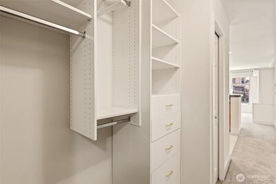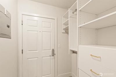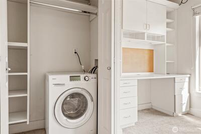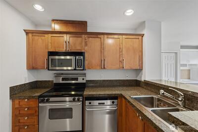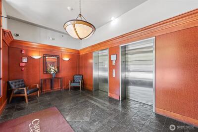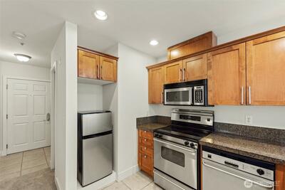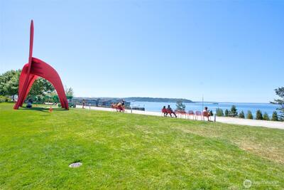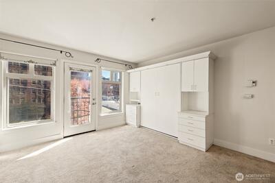 Step into this bright studio, boasting a custom Murphy bed and ample built-in storage solutions. The open kitchen showcases cherry cabinets, granite countertops, and a convenient breakfast bar. Set within a charming brick building, enjoy the tranquil garden courtyard and secure garage parking. Explore just steps from your doorstep, with a bridge leading to the waterfront park nearby and all the delights of Seattle within a few minutes' walk. Welcome to your new home!