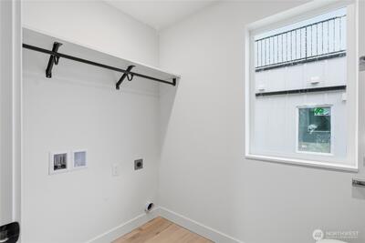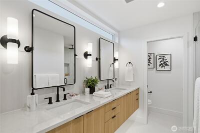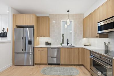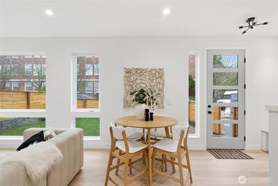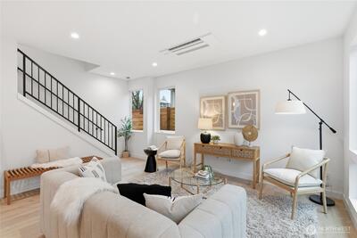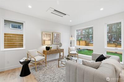 New construction Ballard home with exceptional street presence and thoughtful design throughout. A spacious front yard enhances curb appeal and provides a welcoming entry. Soaring ceilings and large windows bathe every room in natural light, creating an open and inviting atmosphere. The 3-bedroom, 2-bath layout offers versatile living spaces perfect for those who work from home. Premium finishes include Bellmont cabinets, engineered hardwood throughout—no carpet—and heated floors in both bathrooms for year-round comfort. Mini-split A/C in every room ensures climate control through Seattle's warmer months. The primary bathroom features motion sensor lights and a dedicated bidet outlet for added convenience. Walk to NW 65th eateries and Downtown Ballard's vibrant shops and restaurants with an impressive 88 Walk Score and 95 Bike Score. Quick access to Golden Gardens Park and 15th/99 makes SLU/Downtown commutes a breeze. Top-ranked schools nearby!