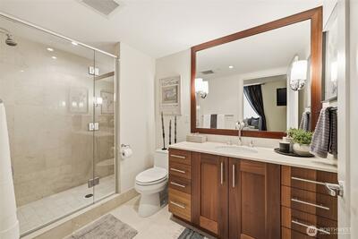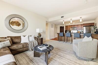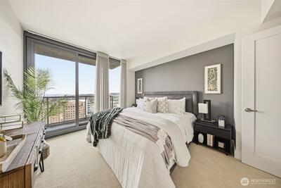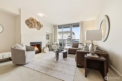 Elevated downtown Bellevue living from a high-floor residence offering expansive north-facing views with visible Lake Washington, city skyline, and a distant mountain backdrop. Ideally located next to the Bellevue Arts Museum and directly connected to Bellevue Square and The Bellevue Collection via interior access for seamless, year-round convenience. The home features an open, well-proportioned layout with excellent bedroom separation, including a private primary suite with walk-in closet and en suite bath. Lightly lived in by the original owner, the residence is pristine and exceptionally well cared for. Full-service amenities include concierge, indoor pool, spa, fitness center, outdoor view deck overlooking Bellevue Way and Snowflake Lane, secured resident entrances, elevators, and common hot water and gas. Gas fireplace. Rental cap not met. Deeded parking and dedicated storage included.