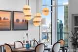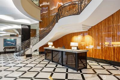 A true Penthouse at Escala — completed in 2019 and thoughtfully refined — offering one of the most compelling and accessible opportunities to own on the coveted top level. Arrive via exclusive elevator to your private vestibule. Step inside and the city recedes, soaring ceilings and walls of glass frame shimmering views and expansive natural light. The kitchen is a statement in craftsmanship: grain-matched teak cabinetry, waterfall quartz island, professional 6-burner gas range, premium appliances, and bold blue tile detail. The primary suite offers spa-level calm; a sculptural soaking tub that fills from above, a three-sided glass shower, and a private water closet. Lutron lighting, modern gallery rail system, and custom integrated desks elevate the experience. Two secured parking spaces are included, with dedicated space in the panel for EV charging for one; a valuable and increasingly coveted convenience. For buyers seeking penthouse living, this residence represents a uniquely