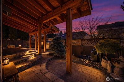 Meticulously maintained and located within the gated University Place community of Danbridge, this light-filled home shines year-round. Soaring cathedral ceilings, walls of windows, and skylights create an airy, uplifting atmosphere throughout. Warm and inviting open living spaces are enhanced by hardwood floors and a cozy gas fireplace, making the home truly move-in ready. The kitchen is both stylish and functional, featuring rich cabinetry, granite countertops, stainless steel appliances, and a generous island—perfect for everyday living and entertaining. The adjoining family room offers comfortable flexibility for relaxing or hosting guests, with a patio door leading to a truly special outdoor space. The covered patio is a one-of-a-kind retreat, complete with an outdoor gas fireplace and multiple water features, creating an exceptionally private and tranquil backyard oasis. Upstairs, the spacious primary suite boasts vaulted ceilings, gas fireplace, a walk-in closet, and a full b