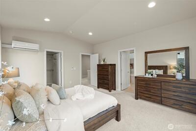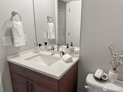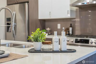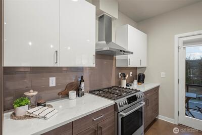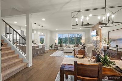 Single Family, Stand Alone Home with Low Maintenance Yard. Breathtaking Snoqualmie Valley & Mount Baker Views! Inspired design, beautiful modern finishes featuring an open concept, soaring 9-ft ceilings & fabulous hardwood flooring. The Great room seamlessly blends with the dining room & modern kitchen design, boasting custom cabinetry, quartz countertops, stainless steel appliances, gas stovetop, oversized island & eating bar for entertaining. Grill on the covered deck all year! This thoughtful floor plan features 4 beds & 4 baths! The Primary bedroom has beautiful views, vaulted ceilings, walk in closet, & a 5- piece ensuite spa like bath, boasting a double vanity, soaking tub & sleek spacious tile shower. The laundry room is conveniently located on the upper level complete with a sink & ample storage. Generous family room on the lower-level including a bedroom or office, full bath, closet for extra storage & outdoor patios. 2 car garage with built in storage racks, entering on the