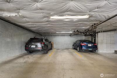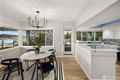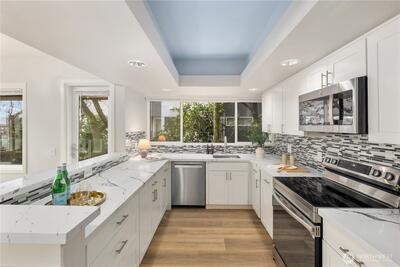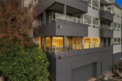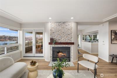 Wake up each day to panoramic water views, the twinkle of the Seattle skyline, and the quiet luxury of modern penthouse-style living. This beautifully reimagined 2-bedroom, 2-bath condo offers a rare opportunity to live above it all, with Lake Union glistening just beyond your private balcony and city lights dancing through your windows every night. Recently refreshed with upscale finishes and a clean, modern aesthetic, this home delivers an effortless blend of sophistication and comfort. The open-concept living space is bathed in natural light, anchored by a sleek kitchen with stainless appliances and stone countertops. Whether you're entertaining guests or enjoying a peaceful evening in, the flow and functionality of this space are undeniable. The expansive primary suite provides a serene retreat, complete with an ensuite bath and generous closet space. The second bedroom is perfect for guests, a home office, or both. Every inch of this home whispers luxury, from the warm floor