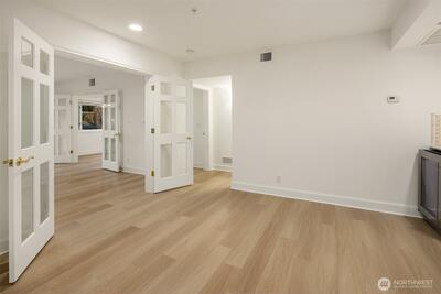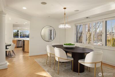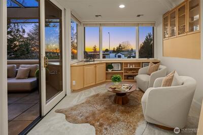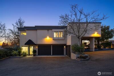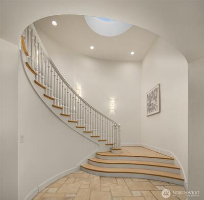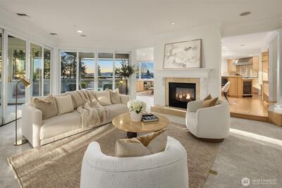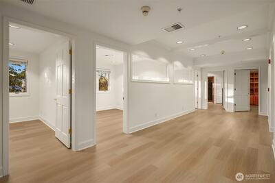 Functioning as one of the Eastside’s only true live-and-work buildings, this Market Street address is purpose-built in Downtown Kirkland. Designed for an owner seeking both residential luxury and professional functionality, the property offers rare flexibility without compromise. The top-floor penthouse residence makes a lasting first impression. A sculptural entry unfolds beneath a soaring curved ceiling, illuminated by natural light. A sweeping staircase traces the wall above layered stone flooring, setting the tone for what follows. Spanning three versatile levels to suit a dual purpose owner, the home is finished in hardwood and surrounded by expansive windows capturing Market Street outlooks. The living room is set by architectural pillars and a statement fireplace, while the sky deck opens to panoramic views of Lake Washington. The primary suite features a sitting area, fireplace, and refined five-piece spa bath. A private office completes the penthouse level. Each floor has a