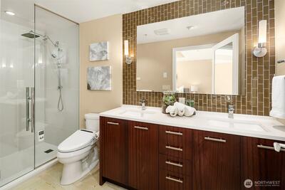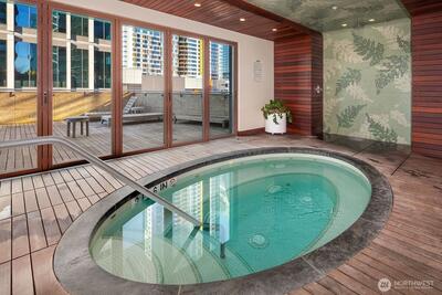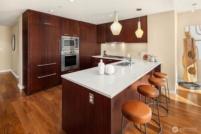 Welcome home to this generous one bedroom condo with views of downtown Bellevue, the Cascades and Lake Washington from the 37th floor of Bellevue Towers. Features of this home include a kitchen with sapele cabinetry, Subzero/Viking appliances and slab quartz countertops, Southern Chestnut floors, custom built-ins for home media and entertaining, along with an office area with built-in desk perfect for working from home. A parking space with EV charger is also included. LEED Gold certified Bellevue Towers offers recently remodeled amenity spaces including fitness rooms, whirlpool spa with sauna and steam room, dining room with kitchen, community room, theater, game room, outdoor terraces, 1/2 acre park, concierge and all the best of downtown: shopping, dining, the Downtown Park and more all at your doorstep.