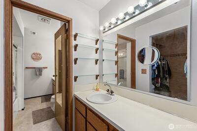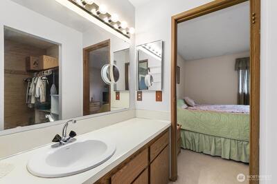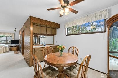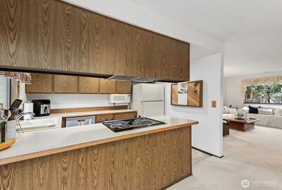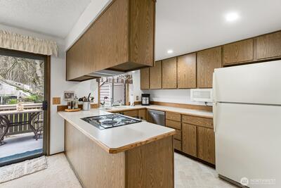 Immaculate and extremely well cared for. Neutral with freshly painted white walls and light carpeting. Lives large! Open, light and bright with big living room open to oversized dining and direct access to private deck. Extra large primary vanity area with sink and walk in closet, plus direct connection to full hall bath makes the floorplan efficient and multi-functional with private bath access from both bedrooms and dual vanities. Large, sun-drenched deck overlooks the beautifully landscaped and manicured greenspace within the complex. Top floor, end unit ensures quiet privacy. Walk to shopping and restaurants, close to Juanita Beach Park (with seasonal Farmer's Market) and convenient to Totem Lake Village and downtown Kirkland. Quiet complex, well landscaped area surrounds you with green space yet centrally located close to everything.
