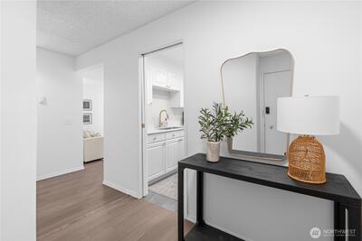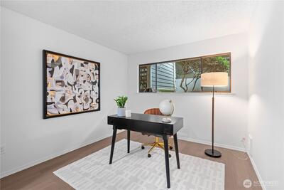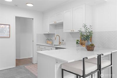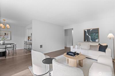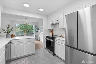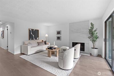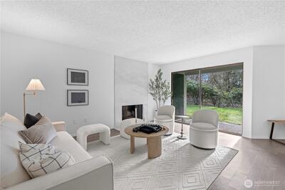 A beautifully updated 2-bedroom, 2-bath first-floor condo in the desirable Greentree Village community in Seattle. This move-in ready home has been thoughtfully refreshed with a fully updated kitchen, brand-new bathrooms, new flooring throughout, and fresh interior paint, creating a bright, modern feel throughout. The spacious living area with a cozy wood-burning fireplace flows seamlessly to your private patio and out to a lush lawn—enjoy the ease of true ground-level living with no stairs and direct access to green space. Ideally located near shopping, dining, parks, and the scenic fairways of Jackson Park Golf Course, residents also enjoy community amenities including a clubhouse, outdoor pool, hot tub, and sauna. Stylish updates, convenient access, and a prime first-floor location make this home an exceptional opportunity.