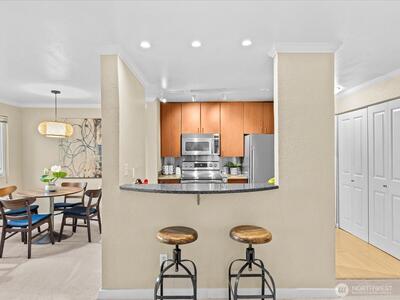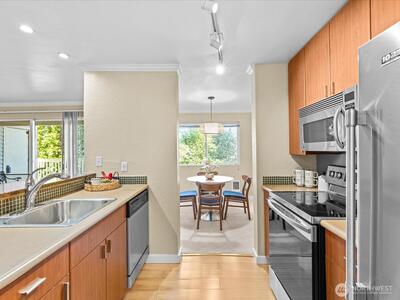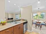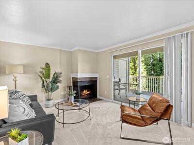 Peaceful end unit condo with no access stairs! New carpeting throughout, warm contemporary color palette, crown molding, granite breakfast bar, stainless steel appliances, bamboo & cork floors, corner fireplace. Sunny, bright, and spacious-with an outstanding location! Still looks nearly new. Territorial and city views from dining room and oversized, covered BBQ Deck with Storage unit. 1 block to seasonal Farmer's Market at Juanita beach & Village. A fantastic location for the commuter with easy freeway access. Wheelchair access from your private extra wide parking space. No rental cap, strong HOA, no special assessments with good reserves. Pet friendly for up to two pets with a combined weight of 60 lbs. Pre-inspected and 1 year home warranty included for your peace of mind! Welcome home to the Kirkland life!
