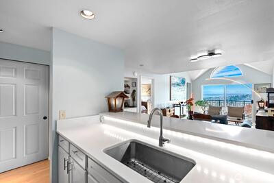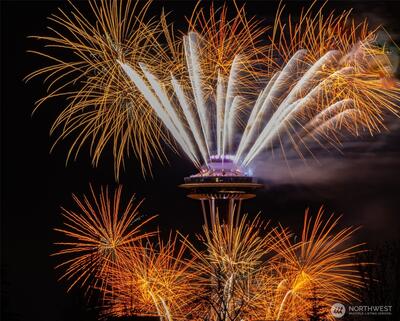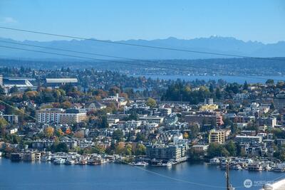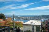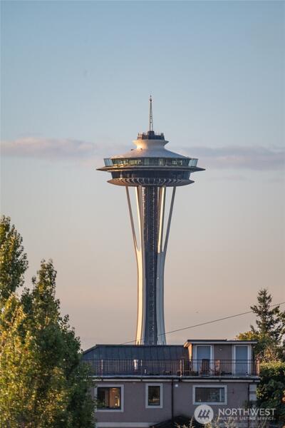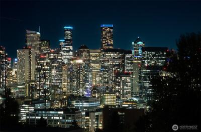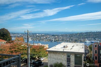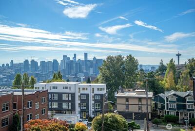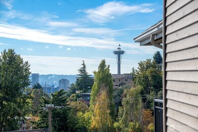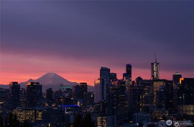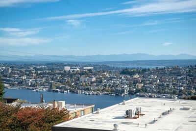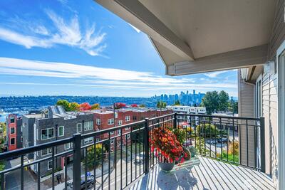 Prepare to be delighted by this top floor unit with cathedral ceilings, spectacular natural light & 180-degree views! This urban pied-a-terre has an updated kitchen with quartz counters, stainless appliances, & skylight. Meticulous hardwood floors, dining room, fireplace, & large deck. The views stretch from the Space Needle & across the city with glimpses of Mt. Rainier, over Lake Union, dotted with Cascade Mountain vistas all the way to Mt. Baker. Enjoy fireworks on New Years Eve & 4th of July. The big bedroom has plenty of room for a King-sized bed & desk/dresser, plus a walk-in closet. Storage & secured covered parking. Just a short stroll (nearly flat!) to top of Queen Anne shopping, restaurants, bars. Enjoy the rare combination of a very well-funded & managed building with affordable dues! No assessments! Priced well below assessed value for quick sale! Don't wait!