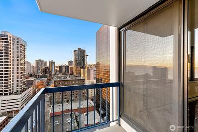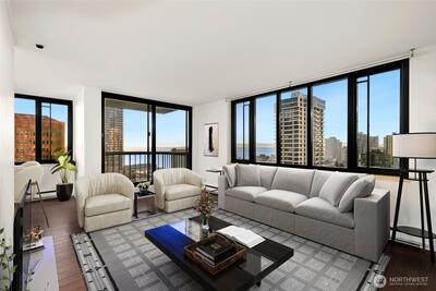 Magnificent views of Elliott Bay, the Olympics, and Space Needle from this 2 bedroom, 1.75 bath corner unit in Belltown. Expansive windows and a covered balcony overlook the water and cityscape. Renovated kitchen with quartz counters and stainless steel appliances. Updated bathrooms feature new tile and fixtures. Primary suite with NW views, walk-in closet and ensuite bath. The second bedroom enjoys water, mountain, and Space Needle views—perfect as a study or guest room. Freshly painted with custom bookshelves. Amenities include outdoor pool, fitness room w/ sauna, community kitchen, BBQs, Amazon lockers, on-site manager & more. Deeded, secure garage parking w/ EV charging. HOA covers all utilities & earthquake insurance. Steps to Pike Place Market, transit, dining, shopping, and the waterfront. Walk Score 99 / Transit 100!
