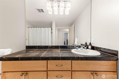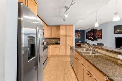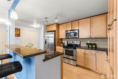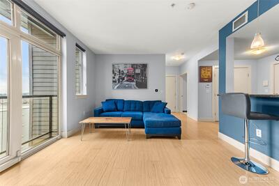 Panoramic views from primary & partial views in living room, steal the show in this stunning 1 bedroom + den (or guest space), at The Reverie at Marcato. With 900 sq ft, this light-filled home offers an open layout designed for both comfort and style, featuring bamboo flooring, granite counters, stainless steel appliances, and wood cabinetry. The versatile den makes an ideal home office or guest space, while expansive windows and a private balcony capture sweeping territorial, city, and mountain views. Enjoy the ease of secure parking, storage, and premium building amenities including a fitness center, private theater, clubhouse, and BBQ courtyard. All appliances stay to include washer/dryer. Dedicated parking space in secured garage & private storage space. Perfectly positioned in downtown Tacoma, just minutes to light rail, I-5, waterfront, dining, and major employers. Urban living at its finest!