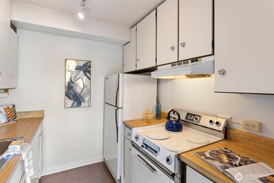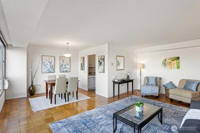 Mid-century living on the 8th floor of Sutton Place—where elevation brings light, breathing room, and open territorial views. Large windows stretch through the living, dining, and bedroom areas, offering morning light, a bright neighborhood outlook, and a side peek toward Lake Union. This one-bedroom home is clean, comfortably scaled, and gently refreshed with updated outlets and fresh interior paint, while original oak parquet floors keep the mid-century character intact. A deeded parking stall in the secure garage is a real advantage in this location—convenient, easy to park, and included in the sale—plus a dedicated storage locker. Sutton Place is a well-managed community with on-site management, secure entry, an outdoor pool and sun deck with restrooms and showers, bike storage, common laundry, and a garage car wash station plus EV charging available. Radiant heat, hot water, earthquake insurance, and Google Fiber high-speed internet are included in HOA dues. No rental cap. P