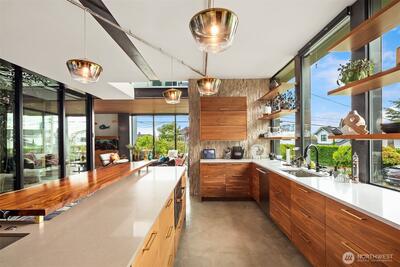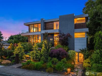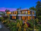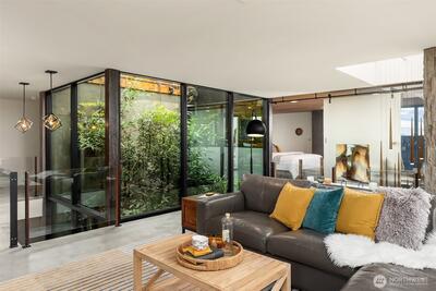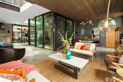 Rare culmination of modern & luxury artfully executed with custom details throughout. Floor to ceiling windows capture lake, city & mountain views while flooding the interior with natural light. Generous great room wraps a two-story atrium with tropical plants & bubbling fountain, integrating the sights & sounds of nature. 5 ensuite bedrooms, including a main floor guest & separate home office. Lower-level suite w/private entry offers MIL potential. Smart home features enable remote automation. Private yard with tranquil koi pond. Gorgeous landscaping surrounds the home with a rainbow of perennial color. Exceptional Lk WA schools & just steps to waterfront parks, shops & dining. Unsurpassed quality & design near desirable downtown Kirkland!