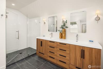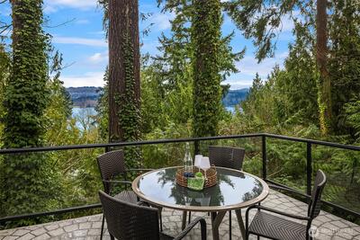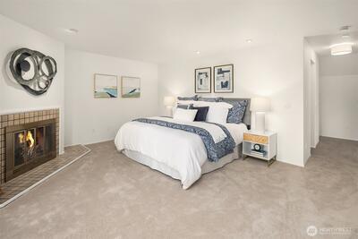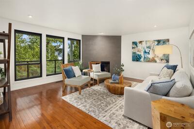 Privately positioned at the end of a quiet drive, this Northwest Contemporary home offers privacy, views, and flexible living just minutes from both Seattle and Bellevue. Elevated above the surrounding landscape, the home captures sweeping outlooks of Lake Washington, the Cascades, and surrounding evergreens—bringing light, openness, and a true Pacific Northwest feel to everyday living. Fresh interior paint, new carpet, and a refreshed kitchen create a move-in ready experience while maintaining the home’s architectural character. Expansive windows, hardwood floors, and multiple fireplaces anchor warm, inviting gathering spaces designed for both daily living and entertaining. A standout feature is the recent renovation of two of the three bathrooms, completed with a refined, modern aesthetic that elevates the home and offers the comfort and style today’s buyers expect. The upper level is dedicated to the primary suite with lake views, a fireplace, and private balcony. The main le