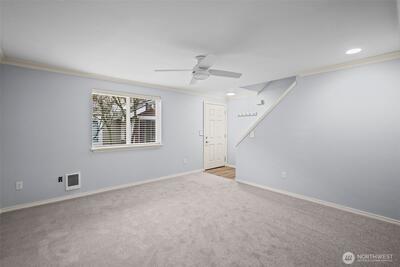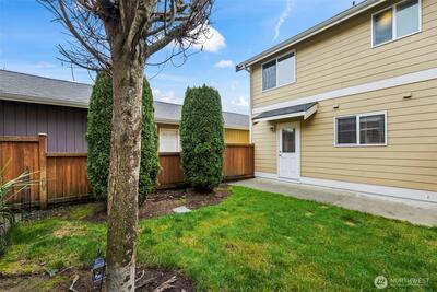 Tucked within a peaceful community of just 32 homes, this beautifully updated residence offers a single-car garage plus an additional exterior parking space. The home features crisp white cabinetry, new countertops, a detailed glass-tile backsplash, sleek black appliances, and brand-new flooring, carpet, and interior paint throughout. The main level opens to a private patio and yard—perfect for relaxing or entertaining—while the upper level includes two bedrooms and a full bath. White blinds throughout provide both privacy and a cohesive, modern look. An oversized garage offers ample storage and includes an automatic opener for everyday convenience. Ideally located near parks, shopping, schools, and easy highway access, this well-maintained community offers comfort, style, and accessibility.