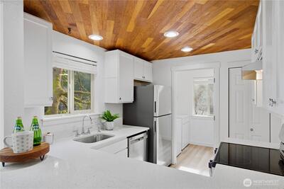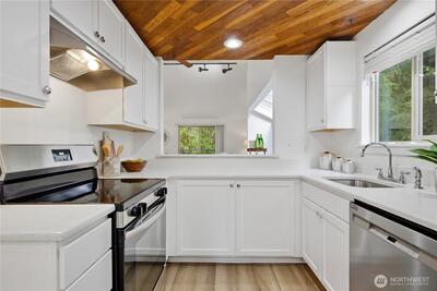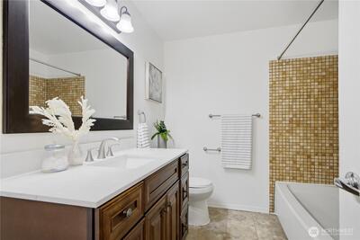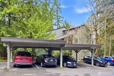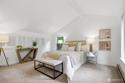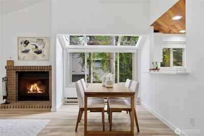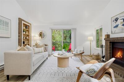 Experience the perfect blend of comfort and convenience in this stunning 3-bedroom, 2-bathroom condo nestled in the serene Cedar Ridge community. Perched on the top floor with a tranquil, park-like setting, this home is a true "commuter's heaven," offering effortless access to Bellevue, the Microsoft campus, and the vibrant downtown hubs of both Kirkland and Redmond. The main level features an open-concept layout with soaring vaulted ceilings and oversized windows. The modern kitchen flows seamlessly into the dining and living rooms, where a timeless real-wood fireplace adds warmth and charm. Step right out from your living room to your spacious patio to expand your living area—perfect for hosting guests or firing up the grill. Two spacious bedrooms share a full bath on the main floor. Upstairs, the loft-style primary suite showcases vaulted ceilings, a walk-in closet, and a 5-piece bathroom. Enjoy ample storage space throughout, plus a generous storage room by the balcony. The