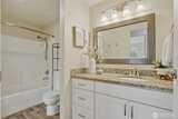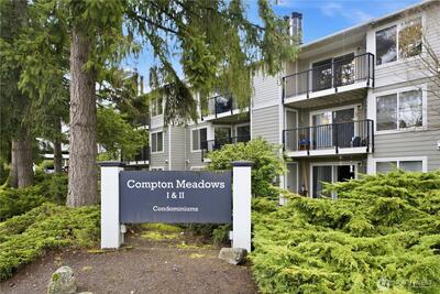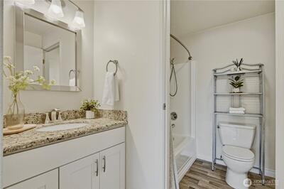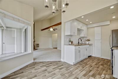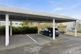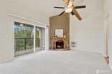 Top-floor end unit with soaring vaulted ceilings and an open, airy layout. Welcoming entry leads to a spacious living room featuring a cozy fireplace and access to a private covered balcony. Kitchen and dining area are filled with natural light from multiple windows, creating a bright and inviting space. Two generously sized bedrooms, with the primary offering direct access to the full bath plus an additional vanity area for added convenience. Large laundry room includes side-by-side washer and dryer and extra storage cabinets. Abundant storage throughout, including deck closet, linen closet, and coat closet. Brand-new carpet. No rental cap. One covered parking space included. Ideally located near Kingsgate amenities, The Village at Totem Lake, Woodinville wineries, parks, and quick freeway access.