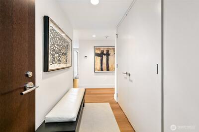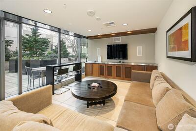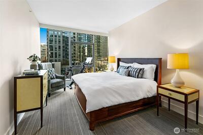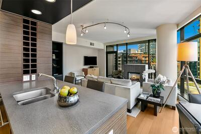 Convenience, luxury and quality define this updated corner 2 bedroom at Enso in the heart of South Lake Union. This fully furnished turn-key condominium with custom designer furniture included, wide plank oak floors, custom lighting, and clever built-ins fulfill city living dreams. High ceilings with a dramatic curved wall of windows wrap the southeast corner providing a jewel box of light with city and Lake Union views from inside and out with a private balcony to expand your living outdoors. Open living layout with a gas fireplace to cozy up and a display kitchen to show off your skills. 2 spacious bedrooms with a 5-piece ensuite bath and huge walk-in closet in the primary. Find your urban respite in this comfortable and contemporary community with full time facility manager and concierge staff, fitness center, community rooms, deck with bbqs, guest suite and a well managed HOA. Two parking spaces and storage included. LEED Gold Certified concrete and steel building. Whole Foods, res