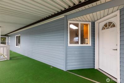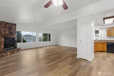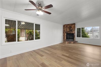 Welcome to comfortable, updated living in the 55+ Pantera Lago community in Kent, WA! This 1,344 sq ft home sits on a desirable perimeter lot and features vaulted ceilings with a bright, open-concept layout. Fresh interior paint and luxury vinyl plank flooring throughout give the home a clean, refreshed and modern feel. The kitchen offers generous cabinet and counter space and flows easily into the dining and living areas, while the wood-burning fireplace adds warmth and charm. Outside you can enjoy the wrap-around covered deck—perfect for relaxing or entertaining—with plenty of space for gardening and outdoor enjoyment. Additional highlights include a newer roof, heat pump and hot water tank, two outside storage sheds, and plenty of parking. Pantera Lago offers fantastic amenities including a pool, hot tub, RV parking, pet park, etc. Make friends and join your neighbors in the many organized community events offered at the club house. You will enjoy living here!