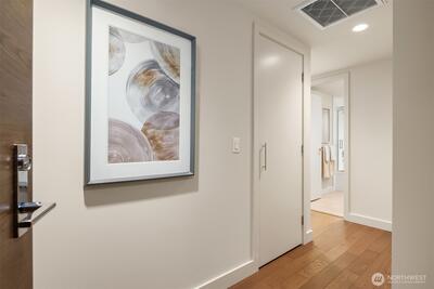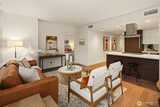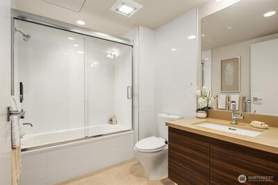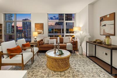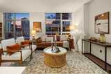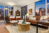 Commanding the SW corner of the 7th floor, this 2BD, 1.75BA residence showcases sweeping city views & an abundance of natural light from walls of floor-to-ceiling glass. The dynamic skyline backdrop & refined interiors create a true urban sanctuary above the energy of the streets below. A gracious entry with coat closet & dedicated laundry unfolds into an expansive open concept living & dining space designed for effortless entertaining. The thoughtfully designed split bedroom layout offers exceptional privacy, with generously proportioned bedrooms positioned on opposite ends of the home. Designer finishes include quartz countertops, sleek Euro-inspired cabinetry, Bosch gas cooktop with cabinet-front dishwasher, Thermador refrigerator, & Grohe fixtures. Wide plank hardwood flooring anchors the kitchen & living areas, complemented by plush carpet in the bedrooms. Marble bath surfaces, custom window treatments, closet built ins, new full size washer & dryer, & central heating & air