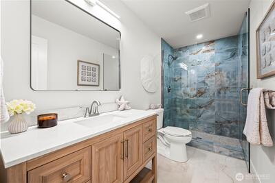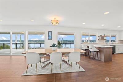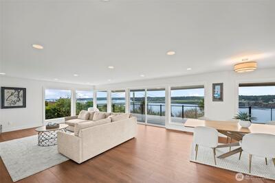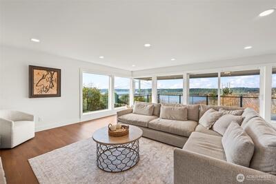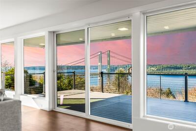 Enjoy unobstructed, front-row views of the water, Narrows Bridge, and Olympic Mountains from this exceptional 4-bedroom, 3-bath home. The sweeping panoramic scenery takes center stage- offering breathtaking sunrises, sunsets, and sparkling evening lights. The open-concept living space flows effortlessly to an expansive view deck, creating the perfect setting for elevated entertaining or peaceful evenings overlooking the Sound. A spacious chef’s kitchen features custom cabinetry, abundant storage, quartz countertops, and elegant wine fridge. The primary suite offers a custom bath and shower, generous walk-in closet, and private access to the deck with stunning views. The expansive lower level provides additional entertaining space, fireplace, full laundry room, and flexible living quarters ideal for guests or multi-generational living. Privately situated on a quiet dead-end street, yet less than a mile from freeway access—this home offers the perfect blend of luxury, privacy, and un