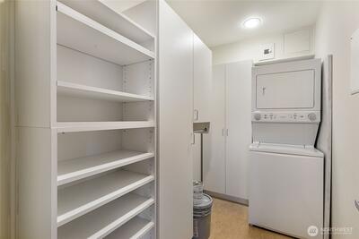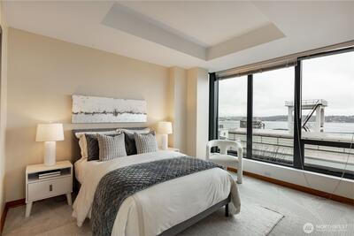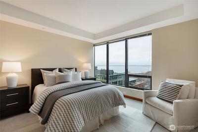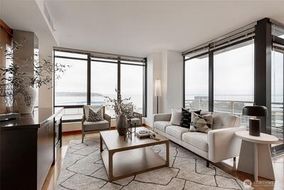 Experience stunning views of Puget Sound, the Olympic Mountains, Sunsets, Ferries, Summer cruise ships, and sailboats. With the Sculpture park, just blocks away, and the revitalized waterfront offers convenient access to restaurants, shopping, the Aquarium and much more. This contemporary residence features an open floor plan, with a gas fireplace, floor to ceiling windows, brand new engineered flooring. and a view deck. The updated kitchen includes an island with granite countertops, modern appliances, and a formal dining area, plus dedicated office niche. The carpeted primary bedroom offers northwest corner views of Puget sound, and Olympic mountains, with a 5-piece ensuite bathroom with tile flooring and European style custom walk-in closet. The second bedroom also features a custom walk in closet with scenic views. Amenities at the Bellora include a fitness room, rooftop outdoor space, concierge services, a parking garage w/ 2 spaces and storage room.