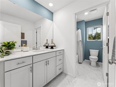 Presley Hills by D.R. Horton in Tacoma - live in a boutique cul-de-sac community of just 21 homes. The Diamond offers 5 Bedrms / 2.75 Bathrms + Bonus Rm (or 6th Bedrm) upstairs. This north-facing 3,002 sq. ft. corner home offers a 3-car garage with a low maintenance, sunny backyard that backs to permanent open space with only one neighbor! Main floor den / 5th bedroom with 3/4 bathroom allows for options on how to use this extra main space. A generous kitchen with walk-in pantry and large island is open to the eating area, dining, and great rooms. Upstairs, the large primary suite includes a spa-inspired 5-pc bathroom and walk-in closet. All the additional upstairs bedrooms have walk-in closets and you'll love the convenience of the upstairs laundry room and spacious bonus room (with closet) which can be another bedroom as well. Our homes come with an impressive list of included features such as 9’ ceilings on the main floor, slab quartz countertops, full height tile backsplashes, s