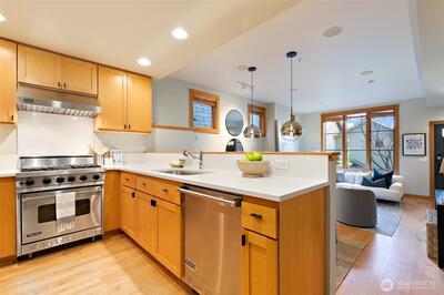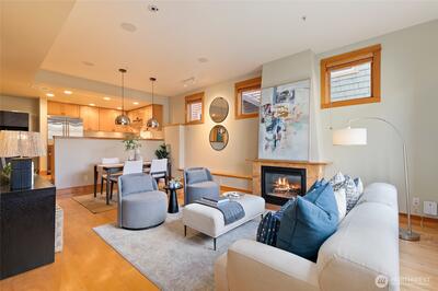 Finally, not a cookie-cutter townhome! Discover an exceptional opportunity to own a truly UNIQUE 3-bedroom, 2.5-bath home in the ARCHITECTURAL AWARD WINNING Stonewater community. Thoughtfully designed and beautifully appointed, this residence blends comfort, style, and location into one irresistible package. Step inside to find elegant limestone entries, rich maple floors, custom wood blinds and a TASTEFULLY REMODELED kitchen with VIKING appliance package with gas-cooking. The inviting gas-fireplace creates the perfect ambiance for cozy evenings at home, while the well-designed layout offers both functionality and privacy. Upstairs, the spacious primary suite is a true retreat with a lux-remodeled bath with large separate tub/shower and quartz countertop. Walk-in custom closet and complete with a private deck showcasing fantastic views of the city and mountains — the ideal spot for morning coffee or evening relaxation. Enjoy the convenience of 2 GARAGE TANDEM SPACES for 2 cars or 1 c