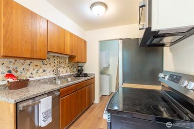 Mid-Century Character Meets Modern Luxury in the Heart of University Village. Experience the perfect blend of 1940s "Old Seattle" architecture & sophisticated modern updates. Tucked away behind mature native landscaping, this stunning 1st-floor home offers a serene, garden-like escape. From the moment you enter through your private exterior entrance, the quality of this top-to-bottom renovation is clear—it is exceptionally clean, comfortable & completely turnkey. Every inch of this home has been meticulously reimagined. Modern luxury meets durability with brand-new LVP flooring & crisp baseboards throughout, complemented by a fresh, contemporary interior paint palette. The chef-inspired kitchen is a standout, featuring a full suite of brand-new stainless steel appliances—including an electric range, microwave, dishwasher & refrigerator—alongside a new sink, disposal & updated GFCIs (in kit & bath). The spa-like bathroom boasts a classic subway tile surround, new vanity & high-end