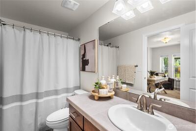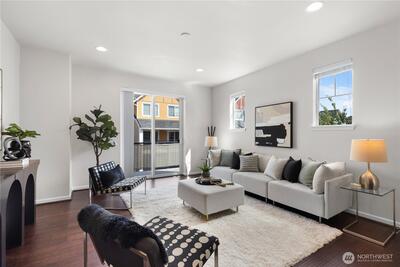 Tucked away in a peaceful community, this West Seattle townhome offers luxury living with the ease of a condo. Step into lofty, light-filled interiors anchored by engineered hardwoods. Cooking is a delight in the high-end kitchen with sleek stone surfaces, built-in stainless-steel appliances, a massive prep/seating island, and cabinets galore. Gather with friends in the adjacent living and dining areas. Upstairs, your primary suite enjoys a Seattle skyline view. A second bedroom, bonus nook, and laundry closet complete the upper level, while a third bedroom with ensuite bath downstairs can flex for guests or an office. You'll love this convenient High Point location, just a stroll away from parks, coffee, and the library. Savor the view to Seattle and Bellevue from your private deck. HOA dues cover professional lawn maintenance so you can relax and enjoy carefree living.