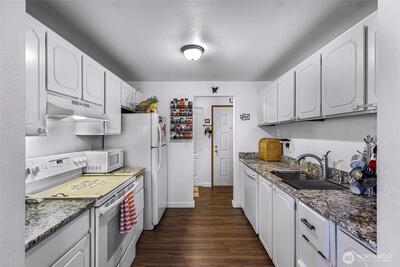 Welcome to your new sanctuary at Tall Firs! This charming 2 bed, 1.75 bath condo is the perfect blend of cozy and cool. Updated in 2019, it features sleek laminate flooring throughout, double pane windows to keep the peace and quiet, and an updated kitchen. The vaulted ceilings in the living and dining areas give the space an airy, open vibe that’s just waiting for you. Forget a parking scramble; you have a dedicated spot right out front and plenty of room for guests nearby. The well managed HOA covers water, sewer, and garbage. Location-wise, you are sitting pretty. Commuting is a breeze with I-5 and Highway 99 just around the corner, and the Light Rail also nearby. The Commons at Federal Way and a variety of local shops and restaurants are just minutes away. Whether you're grabbing a latte at a nearby cafe or enjoying the community greenery, this home puts you right where you want to be. It’s practical, updated, and has just enough personality to make you smile every time you tur