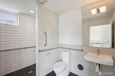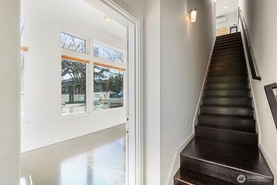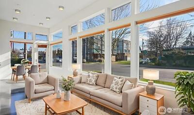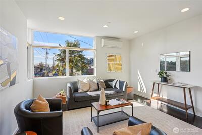 Exceptional opportunity to own a corner live/work townhome filled with amazing natural light throughout. The main living level features an open concept layout, ideal for modern living and effortless entertaining. The upper level includes two comfortable bedrooms, highlighted by a spacious primary suite with a spa inspired bathroom and oversized shower. On the ground floor—with its own separate entrance—a versatile 600 sq. ft. street level flex/studio space offers outstanding visibility and endless possibilities. Complete with its own kitchenette and full bathroom, this space is perfect for work, guests, or rental use. See MLS #2484782 for rental history. A secure parking garage provides convenience and peace of mind. The rooftop deck showcases stunning territorial and mountain views—including Rainier, the Cascades, and the Olympics—creating an ideal setting for relaxing or hosting gatherings. Located in a highly walkable neighborhood close to shops, restaurants, Met Market, and