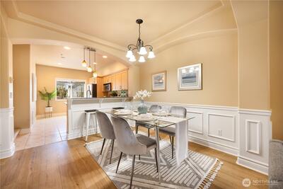 Freshly renovated and move-in ready, this Kenmore townhome is tucked beside a tranquil greenbelt that provides a sense of privacy and a peaceful backdrop year-round. Inside, the updated kitchen shines with granite countertops, stainless steel appliances, warm maple cabinetry, and a built-in wine fridge—perfect for everyday living and effortless entertaining. The open-concept main level feels bright and spacious, highlighted by vaulted ceilings, durable LVP flooring, and a cozy gas fireplace, while refined touches like crown moulding and classic wainscoting add timeless character. Upstairs, you’ll find two generously sized bedrooms and two full bathrooms, along with the convenience of in-home laundry close to where you need it most. Step outside to enjoy your own private patio—ideal for morning coffee, container gardening, or winding down after a long day. The attached two-car garage offers excellent functionality with plenty of space for storage, outdoor gear, and a hobby or w