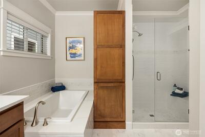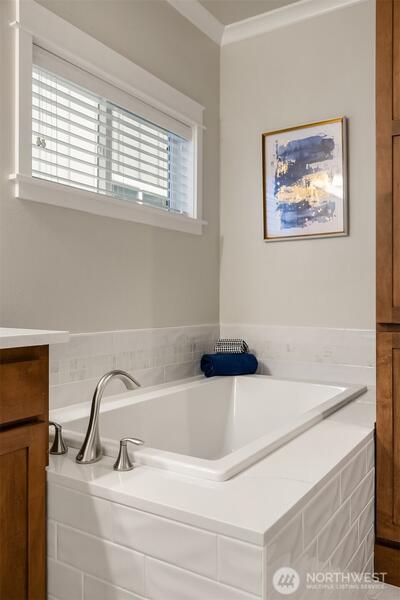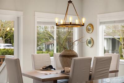 A gorgeous home in pristine condition in one of Issaquah Highlands’ most sought-after neighborhoods, Dahlia Park. An idyllic park-side setting on a sunny corner lot for optimal sunlight. Finished to perfection with fine millwork throughout, including crown molding, wainscoting, wrapped windows, newly refinished hardwood floors, and brand-new interior paint and lighting. The primary bedroom is on the main level, featuring a fully remodeled bathroom with stylish tile accents, a new shower, updated fixtures, and added linen cabinetry. Additional features include A/C, a newer roof, furnace and water heater, and an enhanced garage with a Tesla charger, extra lighting, storage solutions, a generator switch, and a second 220 panel. Enjoy a full-sun, low-maintenance garden patio with gas grill hook-ups and a custom waterline drip system for blooming hanging baskets and plants. The inviting layout offers a grand two-story family room, a large office on the main floor, and upstairs features a