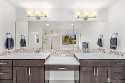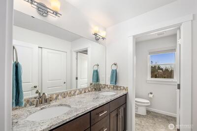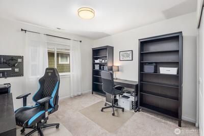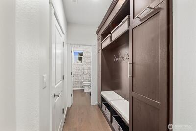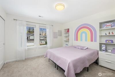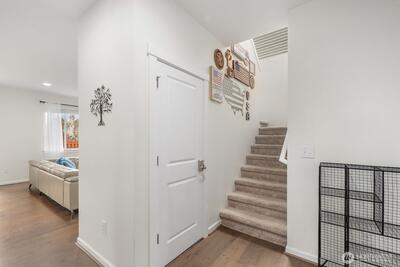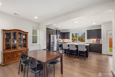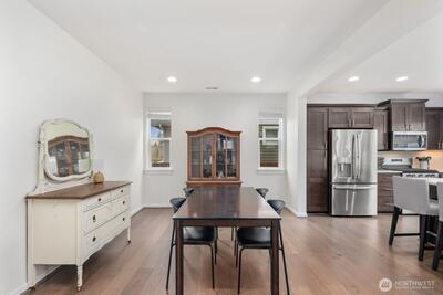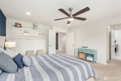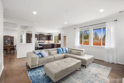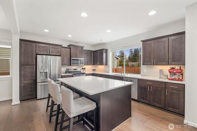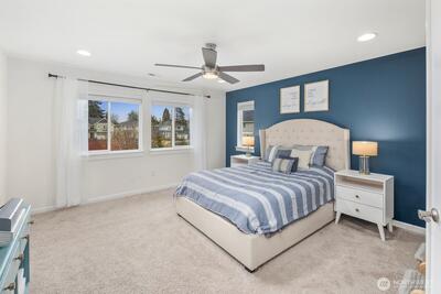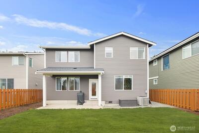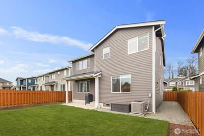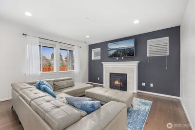 Built in 2019 and still like new, this 2,639 sq. ft. home offers 4 bedrooms and 2.5 baths in a quiet cul-de-sac within a beautifully maintained community, featuring a private neighborhood park at the end of the street. West-facing and backing to a serene greenbelt, the home enjoys abundant natural light and a fully fenced private yard. The open-concept main level showcases hardwood floors, a spacious kitchen with stainless steel appliances, large island with a formal dining area, gas fireplace in the living room, custom blinds throughout, Solar Panel, Tankless water heat, mudroom built-ins, EV charger in garage, new W/D and dishwasher, and A/C—ideal for both everyday living and entertaining. Upstairs features an inviting loft, comfortable secondary bedrooms and bathroom, and a spacious primary suite with a 5-piece en-suite bath and walk-in closet. Conveniently located minutes to the Star Lake Light Rail station with easy access to Sea-Tac Airport and downtown Seattle, and close to