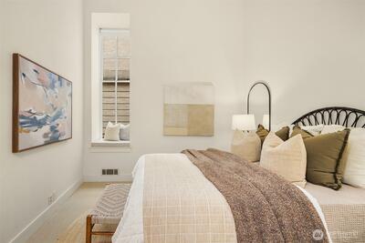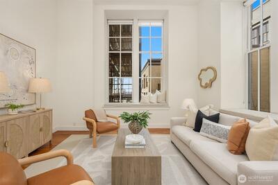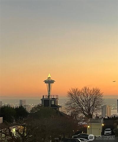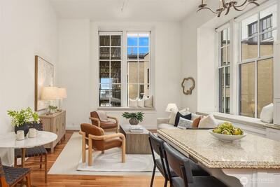 Perched at the top of Queen Anne Hill in the iconic Queen Anne High School, this 1,019 sq ft condo, blends historic grandeur with modern comfort. Enter directly from the impressive Galer street entrance without using the elevator (south elevator access also available) and step into a dramatic living space with soaring 13-foot ceilings and oversized windows, framing views of the Space Needle and Puget Sound. Luxurious 100% wool carpet and wood floors underfoot, the thoughtful floor plan includes two bedrooms, walk-in closet, one full bath, and a versatile loft—perfect for an office, media room, or reading space—overlooking the open living area. Laundry hookup available in-unit, with a free community laundry room just around the corner. Secure, large in-unit storage space is tucked quietly under the loft. Pet friendly and investor friendly with no rental cap, the unit was previously rented for $3,900/month. Two secure indoor parking spaces provide rare ease in this coveted neighb