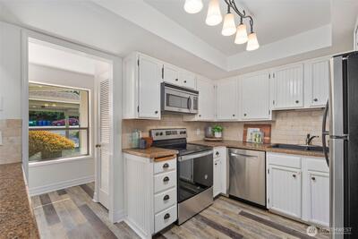 Fantastic location! This charming Kirkland condo is in the sought-after Juanita area, just moments from Juanita Beach Park, shops, restaurants, and downtown Kirkland. The spacious, open-concept kitchen, dining, and living areas feature a cozy fireplace. The kitchen comes equipped with stainless steel appliances and a convenient breakfast bar. Two large bedrooms, including a primary suite with a private en-suite bath. In-unit washer/dryer and plenty of storage throughout. Includes a one-car garage with additional storage space. Don’t miss out on this amazing opportunity!