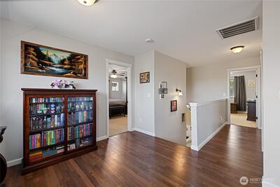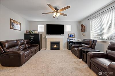 Beautiful, well-laid-out home featuring 3 bedrooms, a bonus room with French doors downstairs, plus a large loft with closet upstairs—both perfect for a bonus room, office, playroom, or potential 4th or 5th bedroom. The open floor plan offers comfortable living with a cozy gas fireplace in the living room and great flow for everyday living and entertaining. The primary suite includes a spacious 5-piece bath with water closet and a large walk-in closet. Stay comfortable year-round with A/C. Step outside to a private backyard sanctuary with mature privacy trees and a fully fenced yard. The covered patio allows you to enjoy being outdoors in any season, making it ideal for relaxing or entertaining. Cherry Meadows is a sought-after neighborhood and for good reason. The large community park offers a basketball court, plenty of room to play catch in the grass, and 2 playsets. The community-led events that bring everyone together, the proximity to town, and the quick commute to JBLM, Lacey,