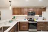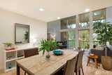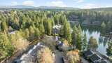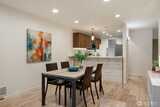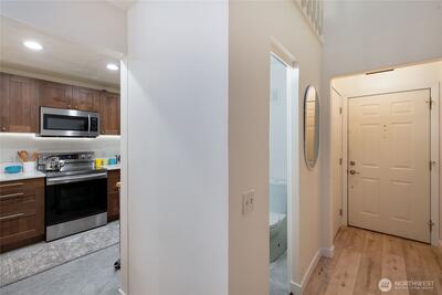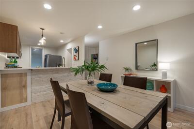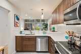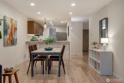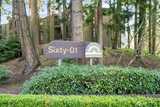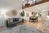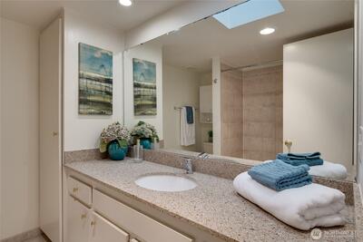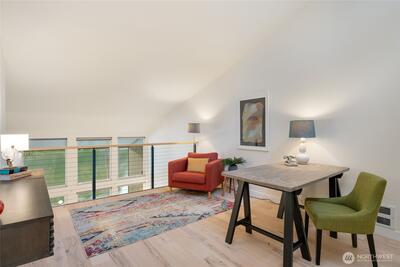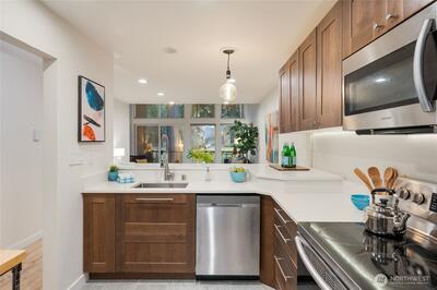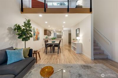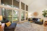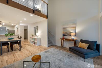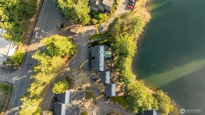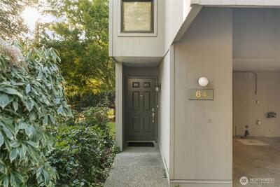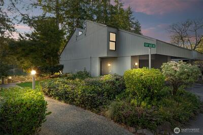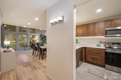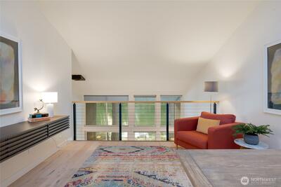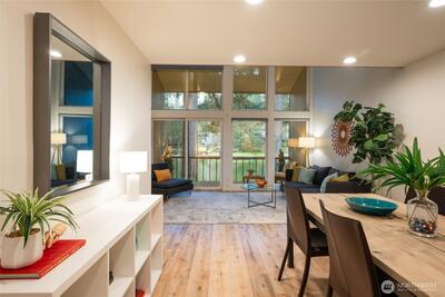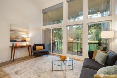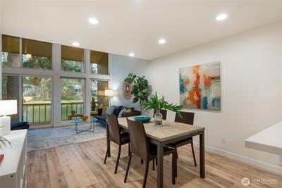 Set at the front of Sixty-01 is this stunning lakefront townhome. End unit home is conveniently located near the entrance of complex but feels private, set amongst the towering trees and walking paths. Enjoy beautiful vistas from the floor to ceiling windows in the spacious Living Room. Skylights and clerestory windows allow soft light on upper level bedrooms and hallway. Light colored, wide plank engineered hardwood flooring throughout home add to the modern and uniform feel of this home. Stylish kitchen is both elegant and functional with warm wood tone cabinetry with lighted drawers. Sleek quartz countertops are combined with stainless steel appliances in the remodeled kitchen. Open floor plan flows to large dining area, perfect for entertaining dinner guests. 1/2 bath and laundry located on main floor. The two bedrooms on upper level are both very spacious with ample closets with new doors. Primary bedroom has interesting architectural elements set into the vaulted ceiling. The sec