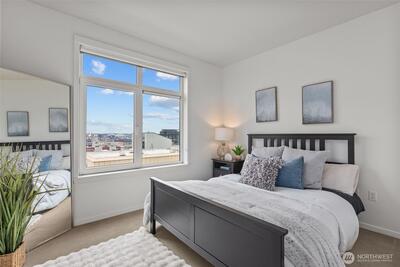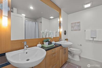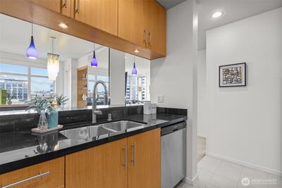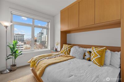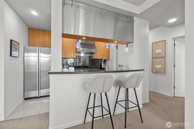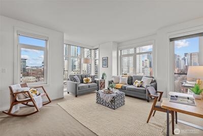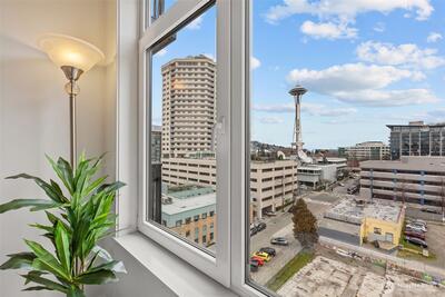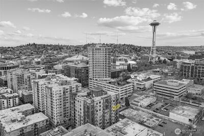Own Iconic Space Needle views from this 10th-floor, 2-bedroom residence in sought-after Avenue One. Ideally located within walking distance to downtown, and the new waterfront park, this home offers the best of city living while providing a peaceful retreat from the street below. The open-concept layout is filled with natural light and features a gourmet kitchen with Viking gas range, stainless steel appliances, and slab granite countertops. Open concept living space, ideal for entertaining. The primary suite includes California Closets, while the second bedroom offers flexibility with a Murphy bed and built-in desk. Additional features include central A/C, in-unit laundry, storage, and 2 secure parking spaces. Full-service building amenities include concierge, club room, fitness center, guest suite, and a rooftop deck with panoramic city and water views.