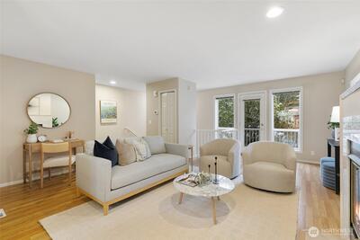 This townhome-style condo in Northeast Seattle puts you right in the center of everything! Leave the car behind and enjoy a short distance to restaurants, shops, the grocery store, library, and all the amenities this vibrant neighborhood has to offer. Skip the typical tall, narrow townhomes with cramped layouts—this home features a spacious, open main level with gleaming hardwood floors, a cozy gas fireplace, and a newly updated kitchen floor that complements the space beautifully. Upstairs, you'll find a generous primary suite with a walk-in closet and private bath, along with a second bedroom, full bathroom, and convenient laundry area—all finished with brand new plush carpet. Major system upgrades provide peace of mind, including a new water heater and furnace (2023) and a brand new roof (2024). A rare 2-car attached garage with EV charger adds exceptional convenience, and with no rental cap, this property offers outstanding flexibility and investment potential.