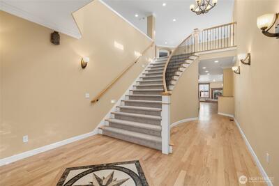 Impeccably maintained, exceptionally spacious, and beautifully designed—this Northshore School District home truly stands apart. A small-maintenance yard paired with a generously sized, feature-rich interior creates the perfect blend of comfort and convenience. Step inside to discover extravagant painted millwork, extensive cherry cabinetry, and a boxed-beam ceiling with elegant dining columns. The dining area includes a built-in buffet with wet bar and wine cooler, while the stunning island kitchen features a 6-burner gas cooktop and slab granite surfaces—ideal for both everyday cooking and entertaining. The grand primary suite offers a serene sitting area, a double-sided fireplace, and a luxury spa bath complete with separate vanities and an impressive 9-head shower. Additional bedrooms are extra-large and include a dual-vanity bath for added convenience. Recent updates include new carpet, refinished hardwood floors, and fresh interior paint, & a storage loft in garage -