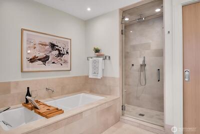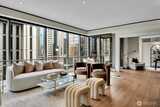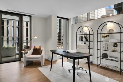 Executive style living at the Four Seasons Private Residences, perfectly located by downtown Seattle's renovated Waterfront District, Pike Place Market, the Seattle Art Museum, and Benaroya Hall. Meticulously maintained 1 bedroom unit with spacious den/office and walls of windows that provide dramatic city light vistas. Primary Suite features a walk-in closet and spa-themed 5-piece bathroom with steam shower, soaking tub, and heated tile floors. Open concept kitchen has elegant finishes and a Sub-Zero/Miele appliance package. Large formal living room with gas fireplace, beautiful hardwood floors, and adjacent dining space. Versatile den/office opens to private deck and can be closed off by a pocket door to serve as a guest room. Automated shades, zone controlled heating, and central A/C provide added comfort. Privacy is paramount at the Four Seasons where residents enjoy unparalleled concierge service, security, valet parking, housekeeping, and room service. A fitness center and spa op