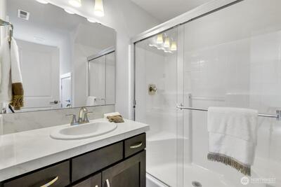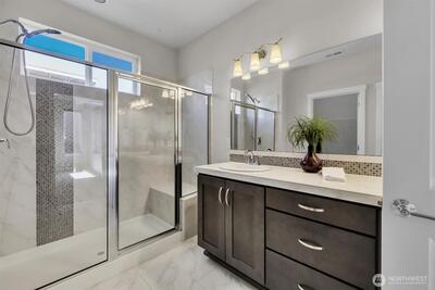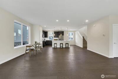 Welcome home to THE ONE! Located in the sought after 12 Degrees North community! This beautifully crafted, modern, single-family home stands out for its expansive open concept design and unbeatable Northeast Seattle location. The main living level is bright, airy, and designed for connection—where generous living and dining spaces flow seamlessly into a contemporary kitchen featuring stainless steel appliances, quartz countertops, and large island. High ceilings, abundant natural light, and beautiful wide plank floors elevate the space. The east facing deck extends the living area to the outdoors. Upstairs, the serene primary ensuite offers a spa inspired bath w/dual walk-in closets, additional bedroom ensuite, and large laundry room. The flexible lower level adds even more versatility with a private 3rd bedroom ensuite with slider to patio—ideal for guests, home office, or multi-generational living. A large 2 car garage completes the package. Enjoy unlimited hot water w/the tankle