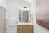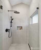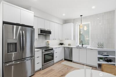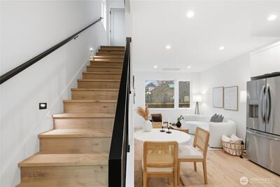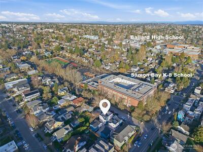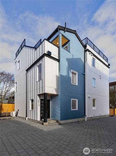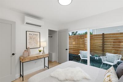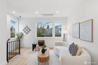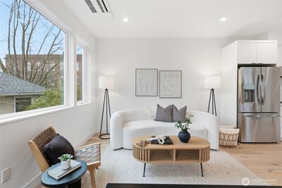 Sophisticated Ballard home offering 1,081sf of thoughtfully designed living space. This 2-bedroom, 2-bath home features a dedicated office—ideal for remote work or creative pursuits. Soaring ceilings and generous windows fill the interior with natural light, while premium finishes elevate everyday living. Enjoy Bellmont cabinets, engineered hardwood throughout (no carpet), and heated floors in both bathrooms. Mini-split A/C in every room provides year-round comfort. The primary bathroom includes motion sensor lights and a dedicated bidet outlet for modern convenience. Assigned EV-ready parking included. Easy access to NW 65th dining and Downtown Ballard—88 Walk Score and 95 Bike Score. Quick routes to Golden Gardens and 15th/99 for SLU/Downtown commutes. Top-ranked schools!